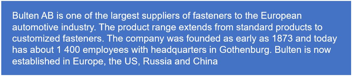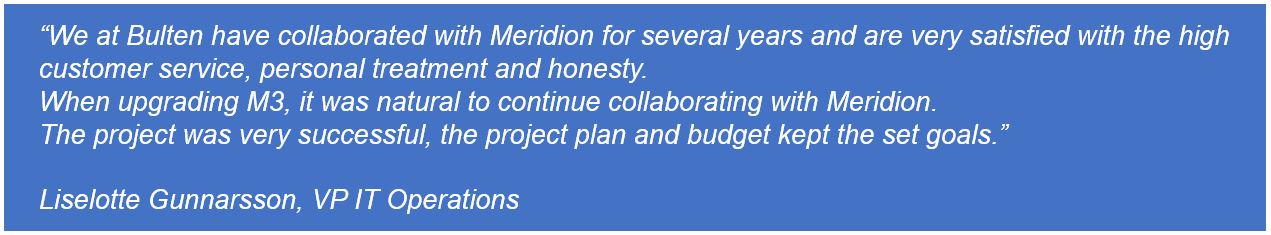 In 2019, Meridion and Bulten realized a successful upgrade and roll-out project together. Meridion upgraded M3 from version 10.1 to 13.4 in Sweden, Germany, Great Britain, USA, Poland, Russia and China with a dedicated and focused team.